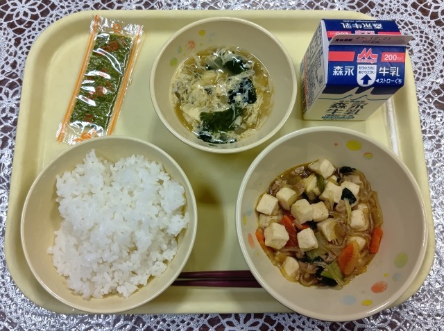 今日の給食メニューは、豆腐のチャンプル・わかたまスープ・ごはん・のり・牛乳です。「豆腐のチャンプル」には、豆腐の他に、豚肉・にんじん・玉ねぎ・チンゲン菜・はるさめなど、たくさんの具材が入っています。