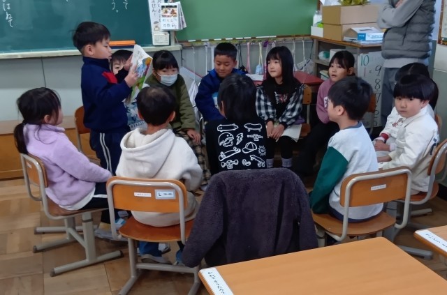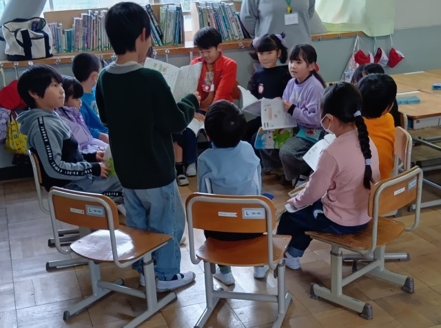 1年生の国語、物語の中で自分のすきなところを読んで、聞いたかんそうを伝えあっています。