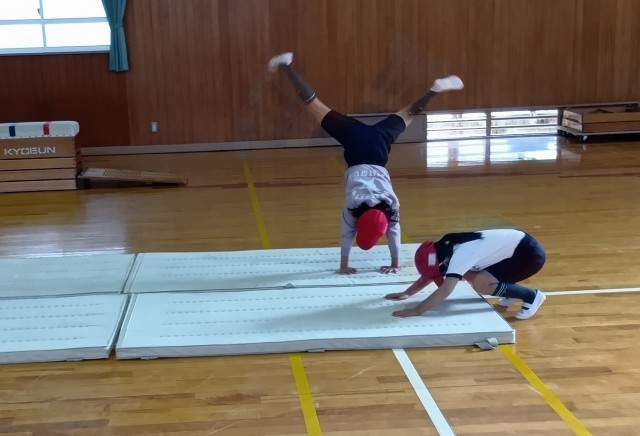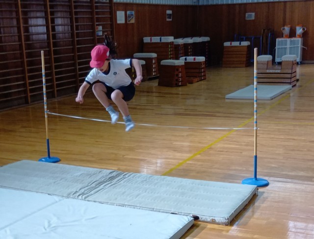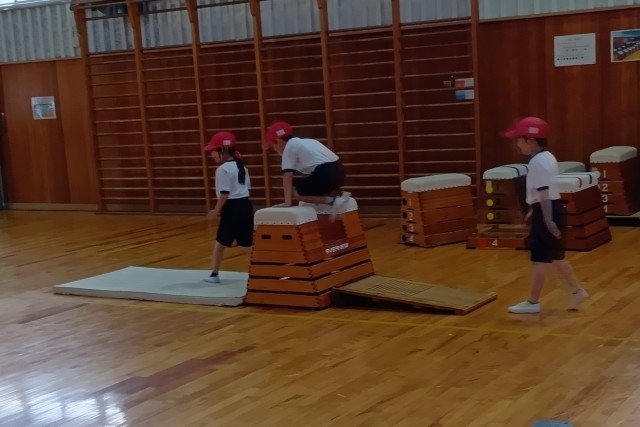 2年生の体育、サーキットコースで跳んだり、回ったり、跳び越えたり、いろいろな動きにチャレンジしています。