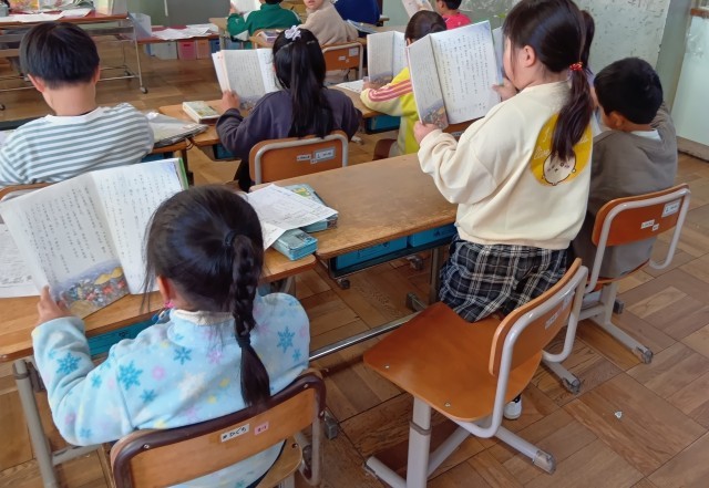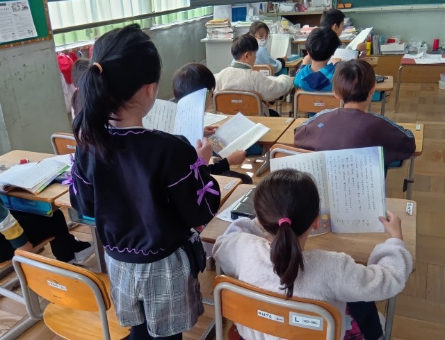 2年生の国語、「かさこじぞう」の物語の音読をお互いに聞き合っています。「かさこじぞう」のお話は、年末年始を迎えるこれからの時期にぴったりのお話です。