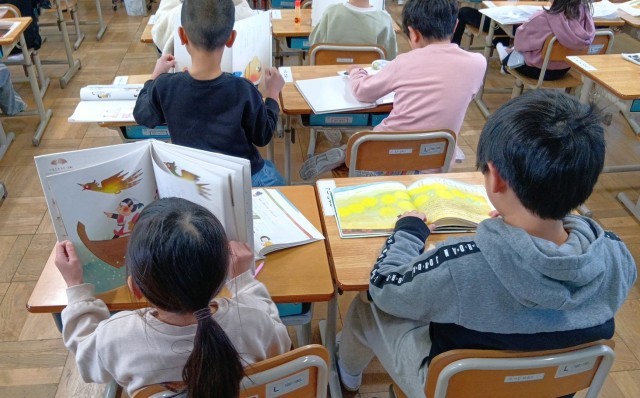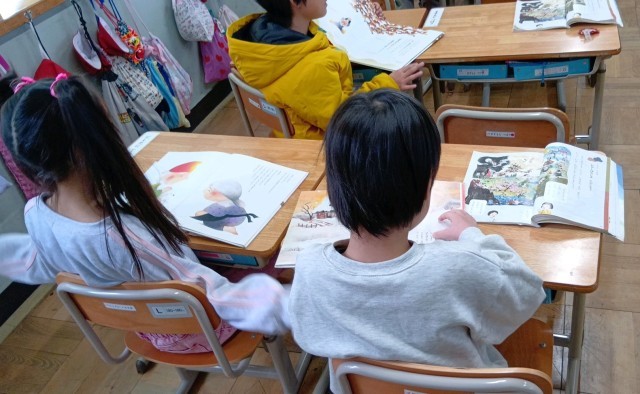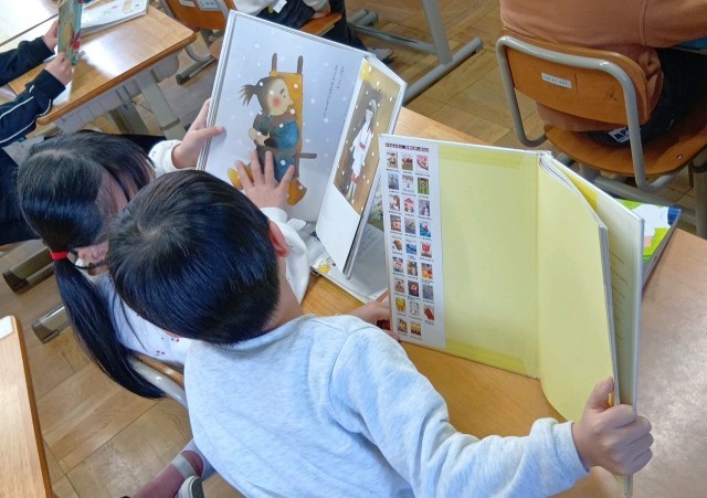1年生の国語の学習、おすすめの「むかしばなし」をしょうかいするために、いろいろなむかしばなしの本を読んで、お気に入りの場面をみつけています。