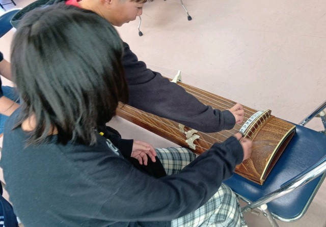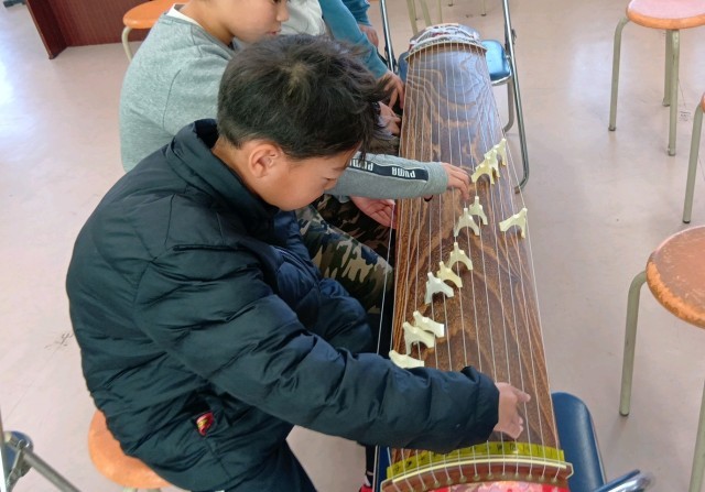 4年生が音楽の時間に琴の演奏に取り組んでいます。はじめて琴に触れる児童も多いと思いますが、きれいな音色が出せるようチャレンジしています。