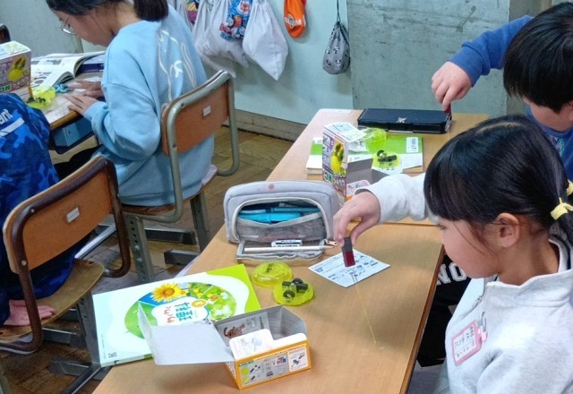 3年生の理科の学習、じしゃくをクリップに近づけてじしゃくの力を確かめています。