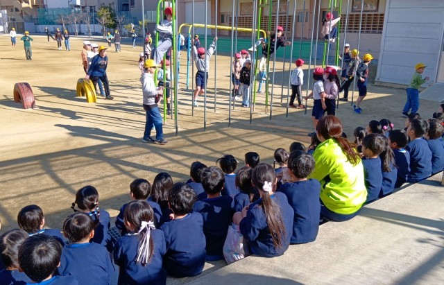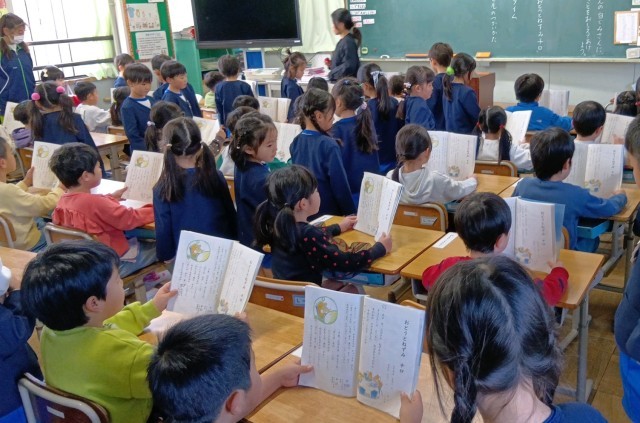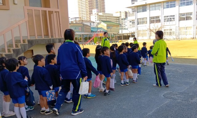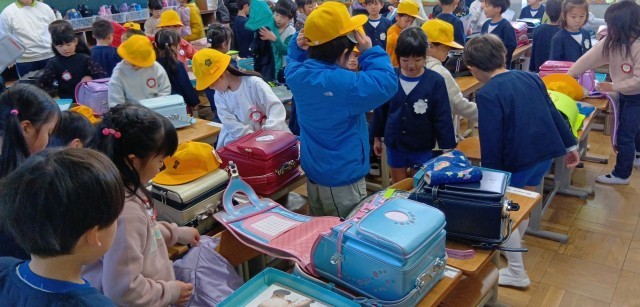 校区内にある住道こども園の年長児のみんなが交流会にきてくれました。1年生の教室での学習のようすや、休み時間の運動場のようすなどを見て目を輝かせている園児たちを前に、1年生のみんなも少しお姉さんお兄さんの顔つきになって張り切っていました。