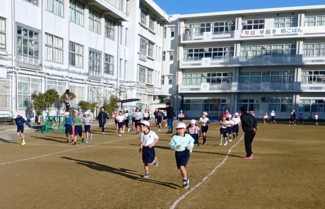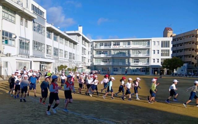 今日は1年生・4年生・5年生が「最後まで自分のペースで走り続ける」ことをめあてに朝のマラソンに取り組んでいます。空気がとても冷たく感じる中ですが、子どもたちは白い息をはきながら一生懸命にがんばっています。