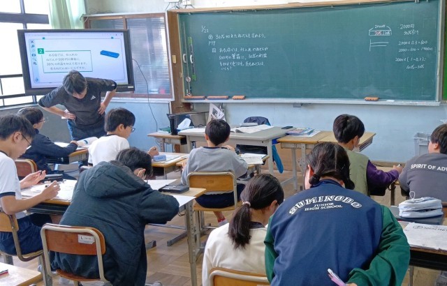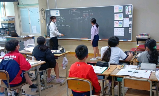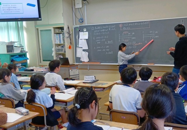 5年生の算数「割合」の学習、「3割引き」や「30パーセントの利益」など、日常の生活とも密接に関わりのある内容です。学年を3分割した少人数学習で学びを深めています。