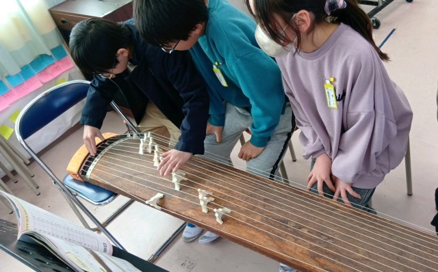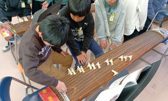 4年生の音楽の学習、琴で「さくらさくら」の曲にチャレンジしています。