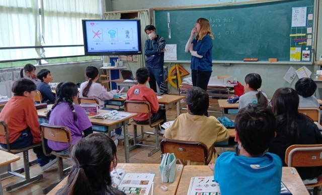 3年生の外国語活動、 「What’s this ? 」「It’s a ~」、AETAssistant English Teacher)の先生のヒントを聞きながらクイズの答えを考えています。