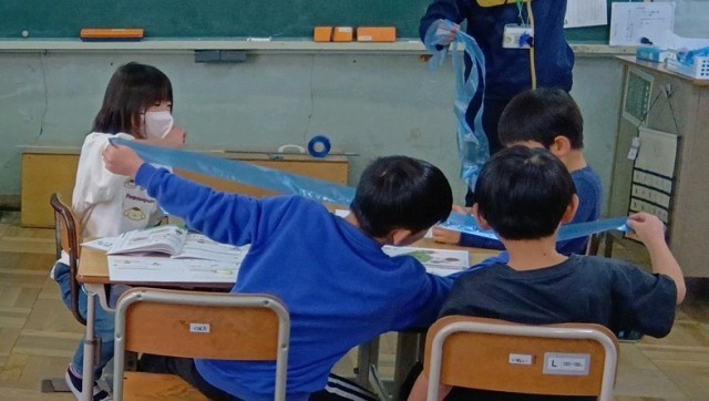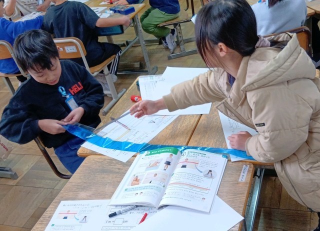 2年生の算数、1m(メートル)の長さについて、数字上だけではなく、実際の長さを見て確かめながら学習しています。