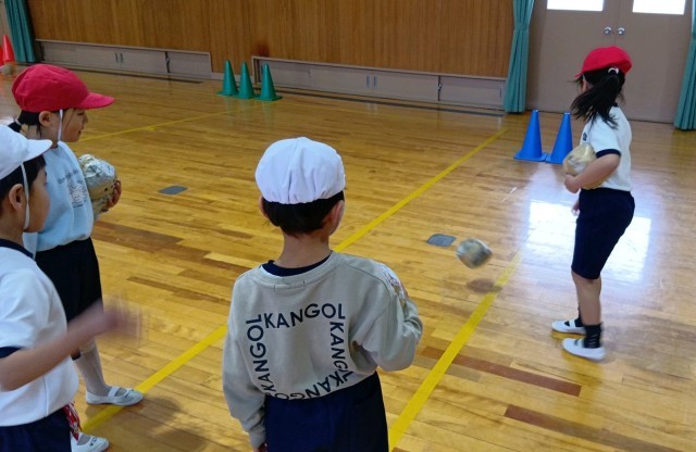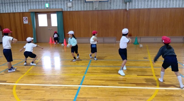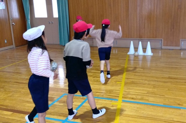 1年生の体育、痛さや怖さを和らげる新聞紙で作ったボールを投げたり蹴ったりして的あてゲームをしています。