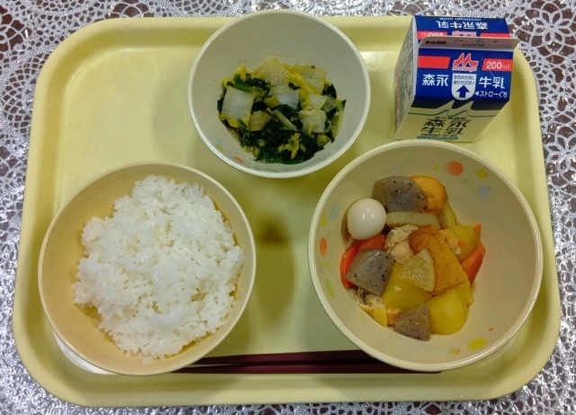 今日の給食メニューは、関東煮・ごはん・おかかあえ・牛乳です。「関東煮」は、江戸時代に関東の人がしょうゆを使った料理を広めるため、みそをつけて食べていたおでんを、しょうゆと砂糖で味付けした料理が関西でも広まりました。今は、関西では、色が濃く甘辛いだしで煮込んだおでんのことを関東煮と呼び、関西風の色が薄く塩味のものをおでんと呼んでいるそうです。