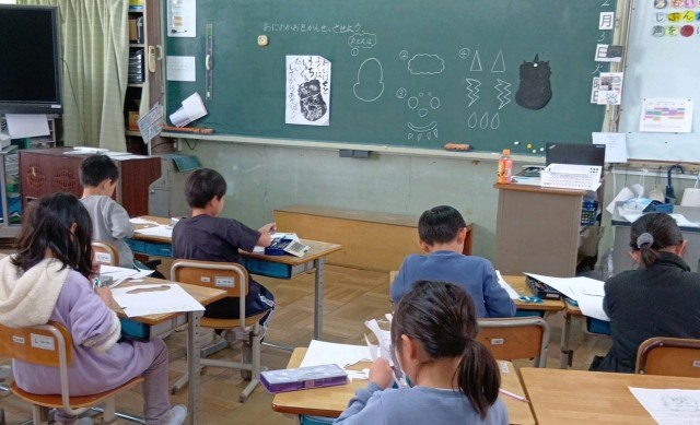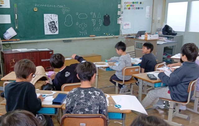 2年生の図工、紙版画づくり、テーマは「心の中のおにをやっつけよう!」です。「しゅくだいめんどくさいおに」「みどりのやさいきらいおに」「ゲームやめられないおに」など、心の中のおに退治です。