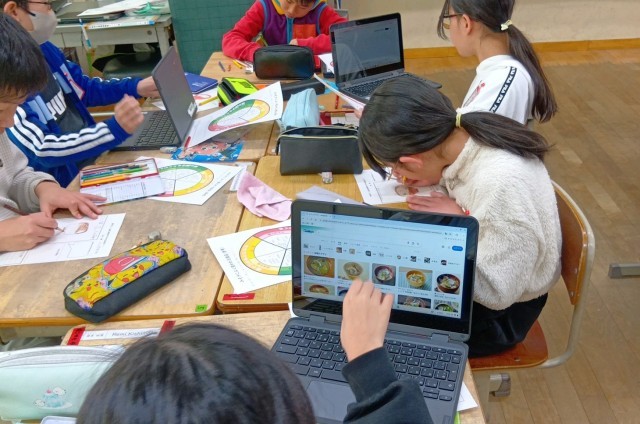 5年生の家庭科の学習、みそ汁の具材について、栄養素や栄養バランスを調べながら考えています。