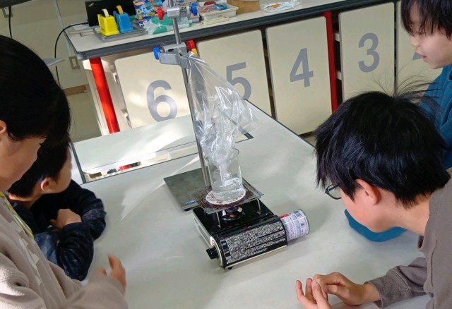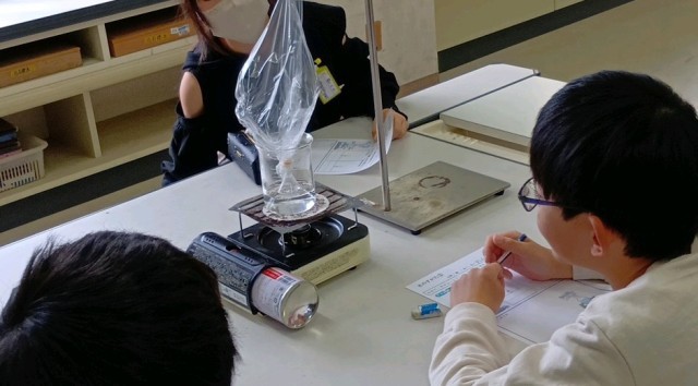 4年生の理科の学習、水が沸騰したときの泡のようすや気体への変化について実験をとおして確かめています。