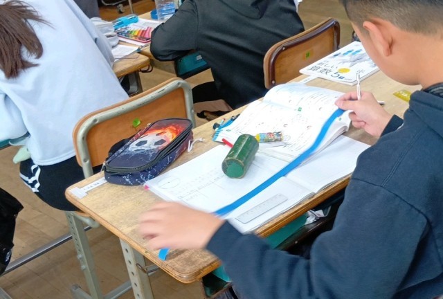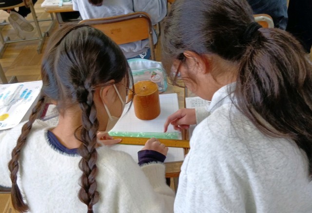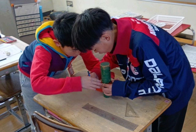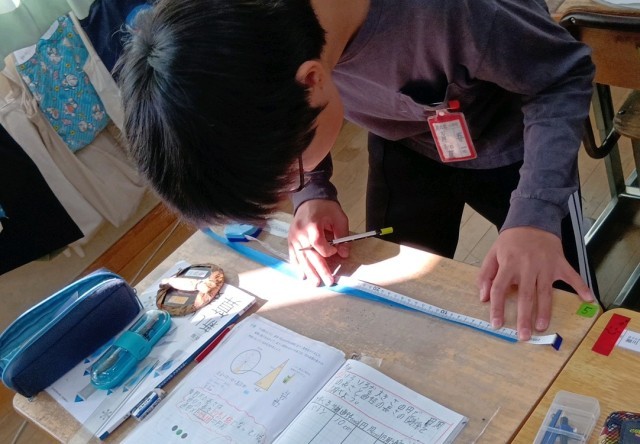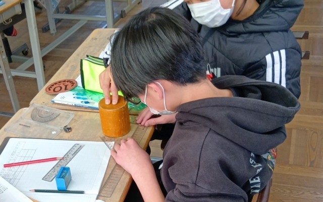 5年生の算数、円の直径と円周の長さとの関係について、実際に円形を使って確かめながら学習しています。