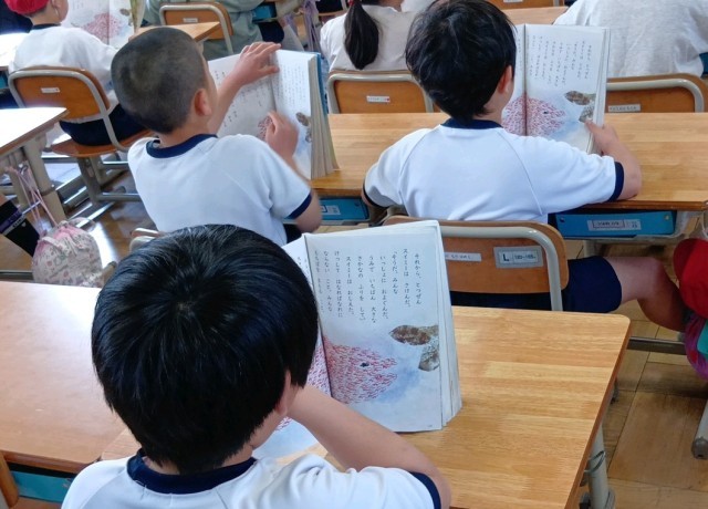 1年生の国語の学習、「スイミー」の物語の場面を想像しながら読み進めています。