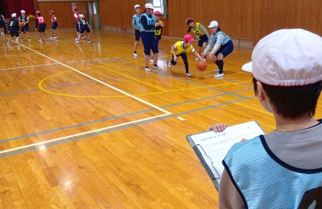 6年生の体育、3人対3人のミニバスケットボール、まわりを見てとてもよく動いています。仲間のよい動きを記録してよりよい動きへとつなげています。