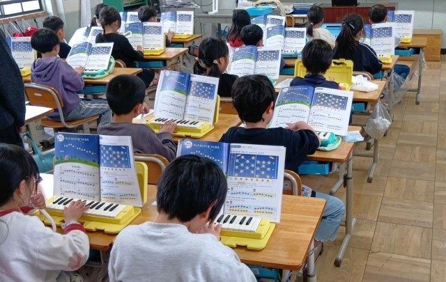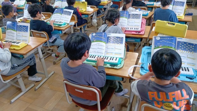 1年生の音楽、けんばんハーモニカで「きらきらぼし」の曲を演奏しています。指のはこびも、ずいぶんとスムーズになってきました。
