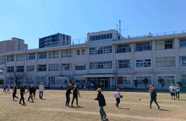 さわやかな青空と、すこし暖かさも感じられる陽ざしのもと、休み時間にはたくさんの子どもたちが運動場で体を動かしています。今日は卒業式の予行も行い、6年生は卒業式まであと2日となりました。仲間と過ごす時間をかみしめているようです。