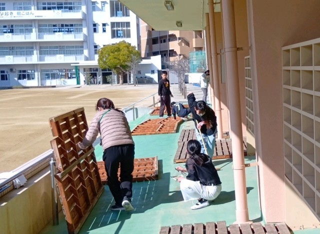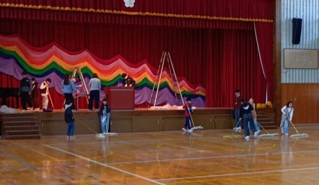 明日の卒業式にむけて、5年生が中心となり会場の準備を行いました。体育館フロア、体育館まわりの掃除をはじめ、下足室や廊下など、明日の卒業式が晴れやかなものになるよう心をこめて、ていねいに準備をしました。