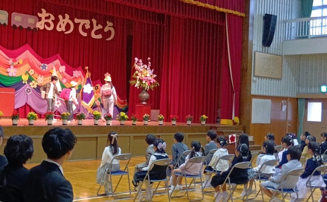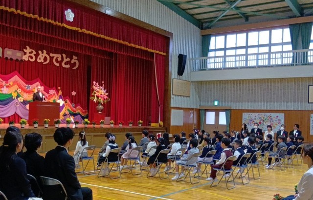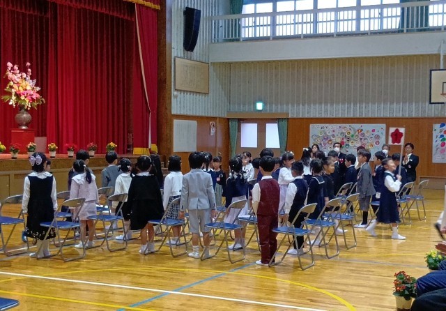 34名の新1年生を迎えて入学式を行いました。小学校の大きな校舎や、広い体育館に少し緊張しながらも、「がんばるぞ!」というやる気に満ちた表情がたくさん見られました。明日から、2年生から6年生のお姉さんやお兄さんたちと一緒に元気に登校しましょう。