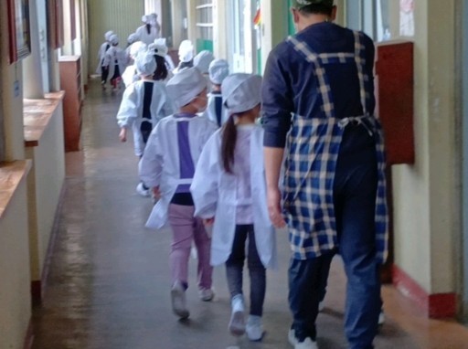 1年生の給食がスタートしました。当番さんたちが給食室まで給食と食器を受け取りに行って教室まで運びます。今日の給食メニューは、米粉カレーシチュー・ごはん・チキンナゲット・牛乳です。小学校ではじめての給食はどうだったかな?