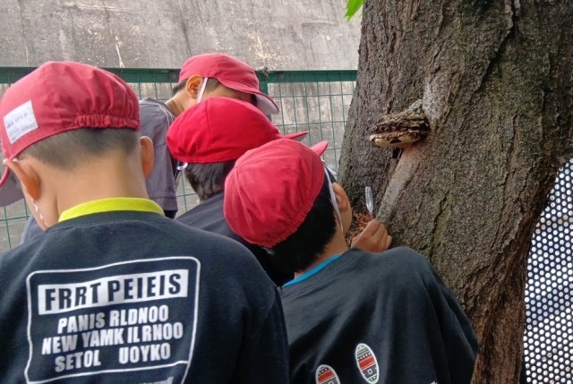 3年生の理科の学習、校舎のまわりにある植物やいきものをさがして、虫めがねを使って観察をしています。