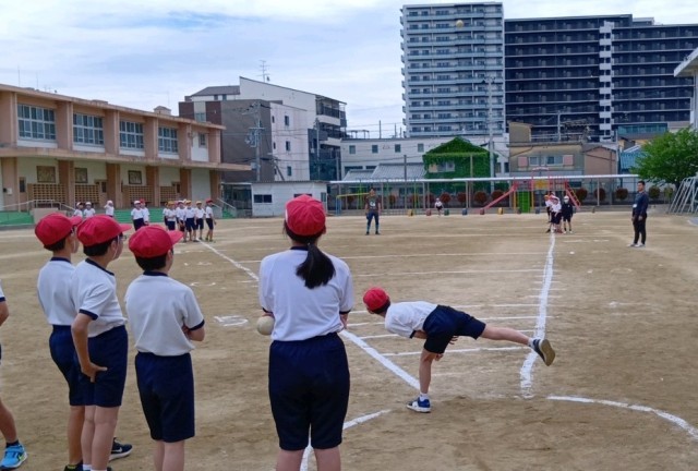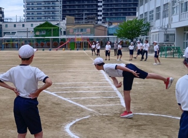 3年生から6年生がスポーツテストのソフトボール投げに取り組んでいます。遊びの中でボールを投げる経験が少なくなっていることもあり、ボールの投げ方自体に戸惑う児童もいるようすでした。