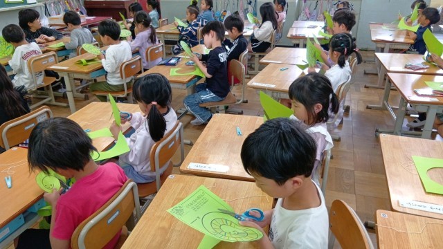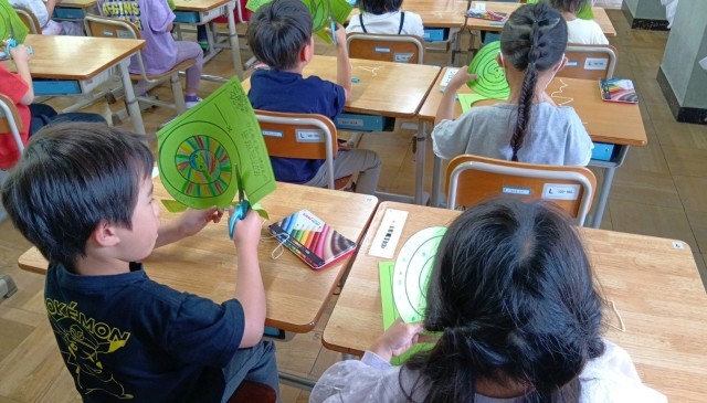 1年生の図工、紙をまわしながらゆっくりとはさみで切っていきます。