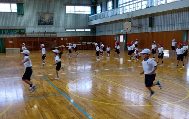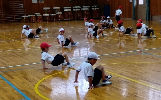 2年生の体育の学習、ワニさん歩き・クモ歩き・ケンケンなど、いろいろな動きを楽しみながら身につけていきます。