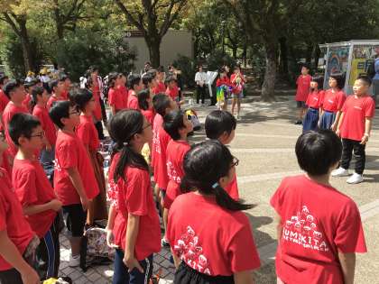 折り鶴セレモニーが始まり、平和への願いを込め、全校児童で取り組んだ折り鶴を捧げます。