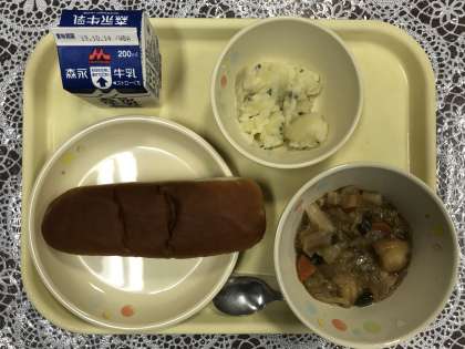 10月8日(火)の給食献立は、ハニーパン・白身魚のみそ炒め・じゃがバター・牛乳でした。