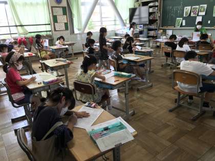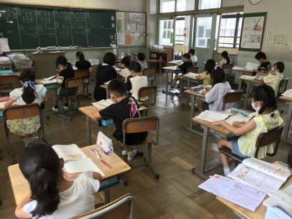 土曜授業、2年生の各教室の様子です。1学期の仕上げに向けて1組、2組とも学習課題に黙々と取り組んでいました。