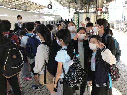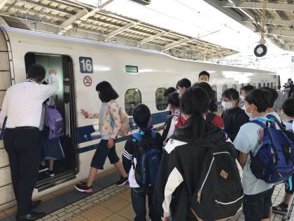 新幹線の到着にワクワク。マスク越しの笑顔キラキラ。
