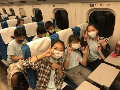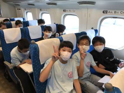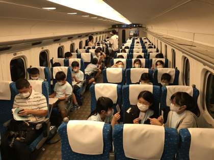 新幹線車内での様子です。車内での移動はできるだけ控え、座席を回転して対面で利用することも控えています。声の大きさを考えて、横並びでのカードゲームはOKです。