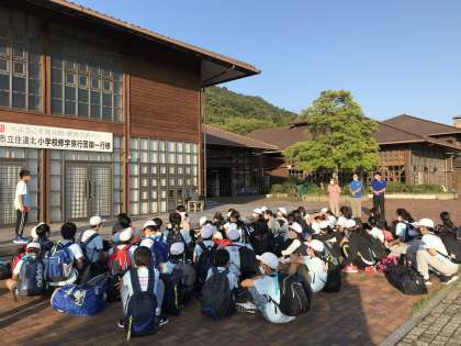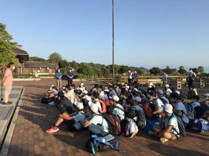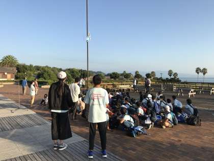 お世話になる宿舎の方々に挨拶し、子どもたち手作りの学年旗を掲揚しました。
