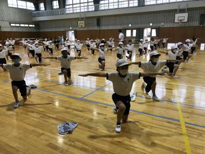 5・6年生の運動会練習です。小旗(フラッグ)を使った演技も考えているようで、今日はタオルを代用して練習をしていました。
