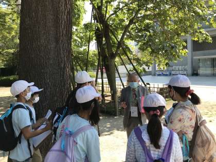 例えば、平和記念公園内にあるたくさんの慰霊碑や祈念碑を調べて回る碑めぐりでの現地ボランティアガイドさんとの出会い。