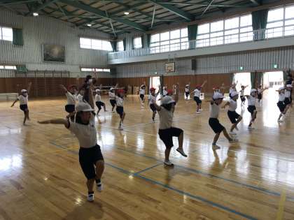 片足で立ち、バランスを取る動きなど、難しい動きを、体育館で丁寧に練習していました。