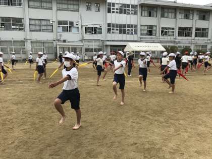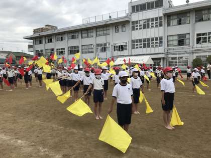 ソーランチームとダンスチームがこれまでの練習の成果を披露し合い、その後、5・6年生全体で小旗を使ったマスゲームや、集団行動の練習に移りました。