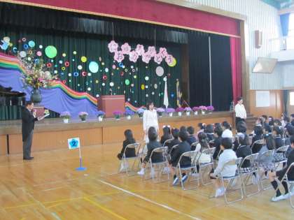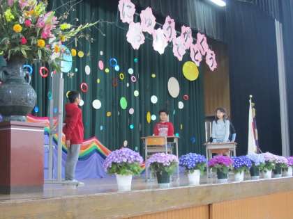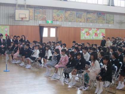 4月7日(月)、晴れやかな青空のもと、本校体育館において平成26年度入学式が行われました。新入生は57名。少し緊張しながらも、学校の名前を元気に言ったり、「朝ごはんを食べてきた人」の問いかけに、「はい!」と手をあげてこたえていました。児童会代表のお兄さん、お姉さんが学校生活を劇にして紹介してくれると、よく見て、笑ったりしていました。