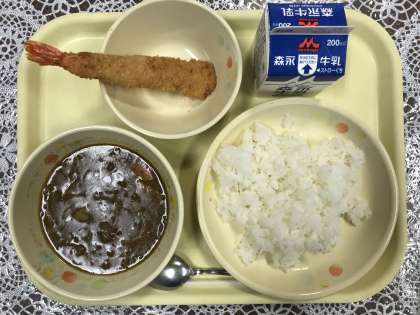 今日の献立は、ごはん・カレーシチュー・えびフライ・牛乳でした。