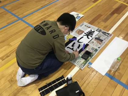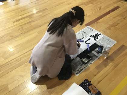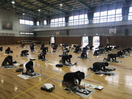 4年生は、学年合同で、体育館にて「書初め」を行いました。