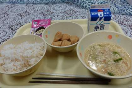 今日の献立は、玄米ご飯、かきたま汁、がんもどきの含め煮、ふりかけ、牛乳です。