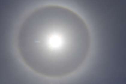 「ハロー」と呼ばれるこの現象は、薄い雲が太陽付近にかかったときに、雲の中の細かい氷の粒に当たった太陽光が屈折したり反射したりして起きるそうです。「日暈(ひがさ)」とも呼ばれているそうですよ。