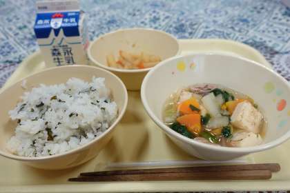 今日の献立は、じゃがきんぴら、寄せ鍋風、わかめご飯、牛乳です。