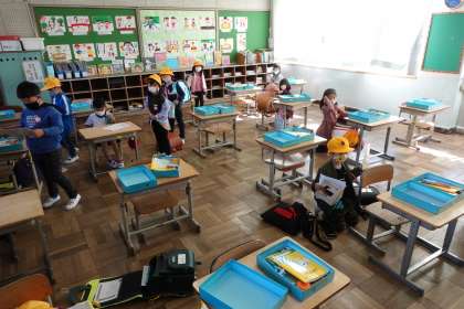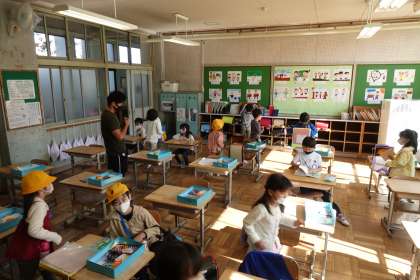 写真は朝の準備をする1年生です。今日も1日頑張りましょう。
