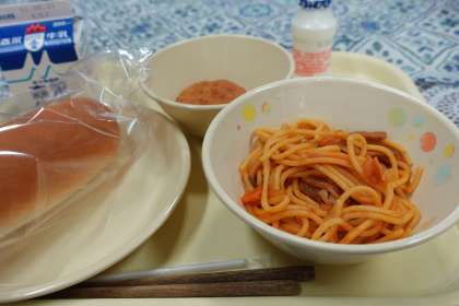 今日の献立は、スパゲティナポリタン、コーンコロッケ、ベビーパン、ヨーク、牛乳です。