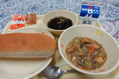 今日の献立はコッペパン、もずくスープ、魚のオイスターソース、ミルクバター、牛乳です。