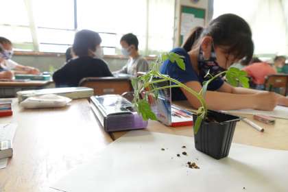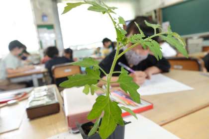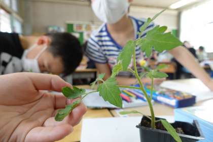 2年生です。トマトの苗を観察しています。